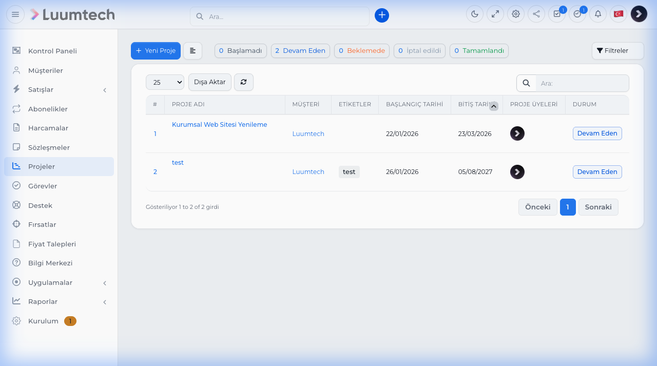 Luumtech CRM'de proje yönetimi, müşterilerinize ait projeleri baştan sona yönetmenizi sağlar. Görev atama, zaman takibi, faturalama ve müşteri erişim ayarları ile kapsamlı bir proje yönetim deneyimi sunar.