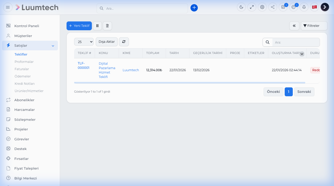 Proposals modülü, müşterilerinize detaylı ve profesyonel iş teklifleri hazırlamanızı sağlar. Şablonlar, açık metin düzenleme ve dijital imza desteği sunar.